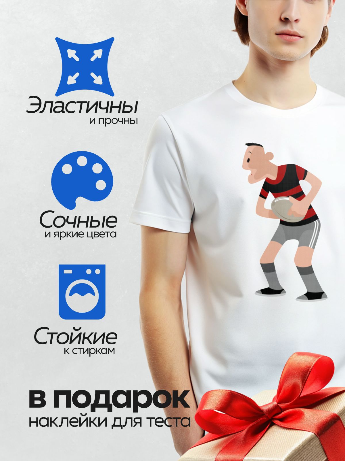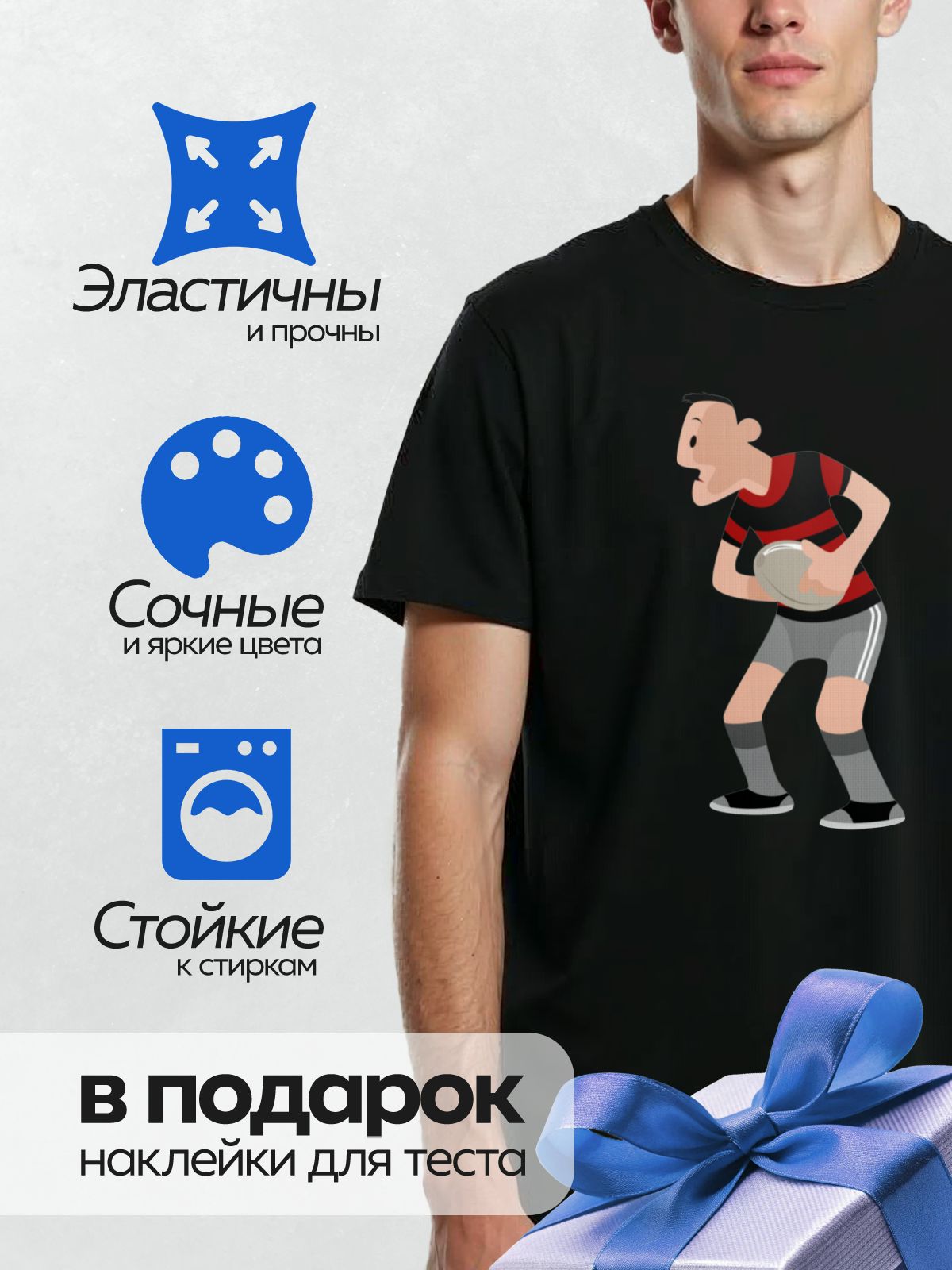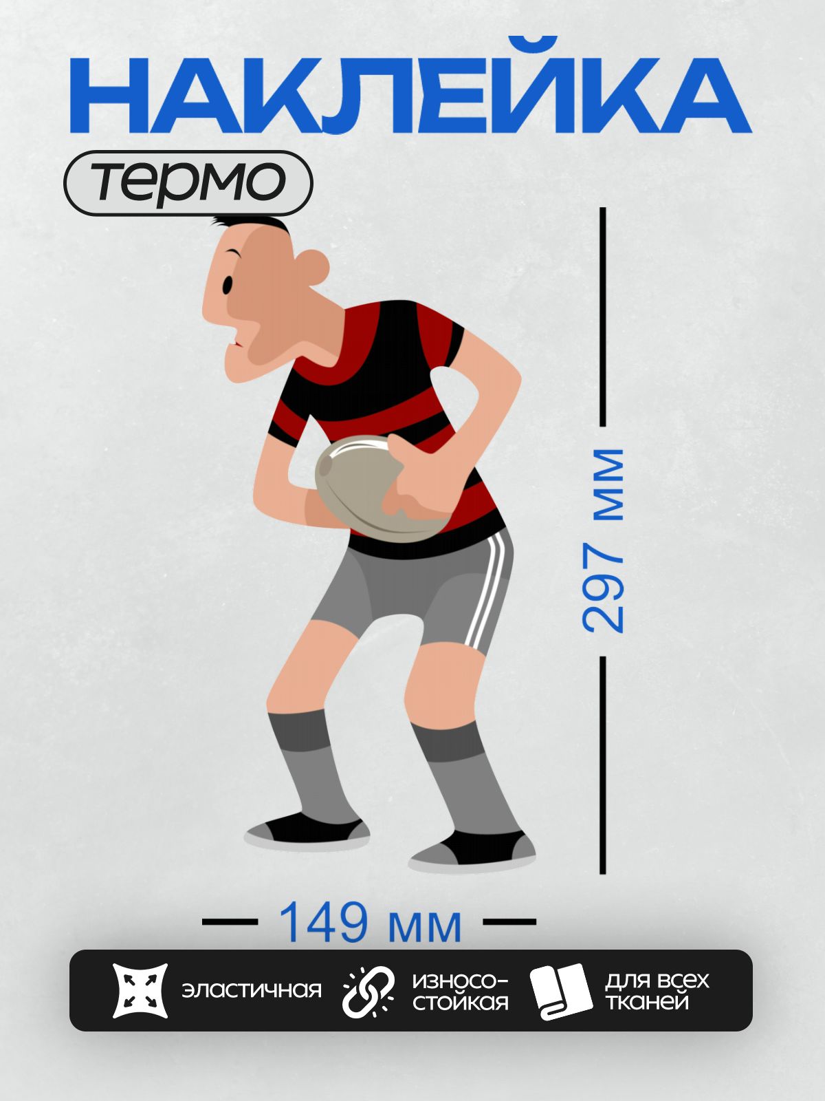 Дизайн: Мультяшный игрок в регби с мячом в руках. — идеально подходит для декора и восстановления одежды.