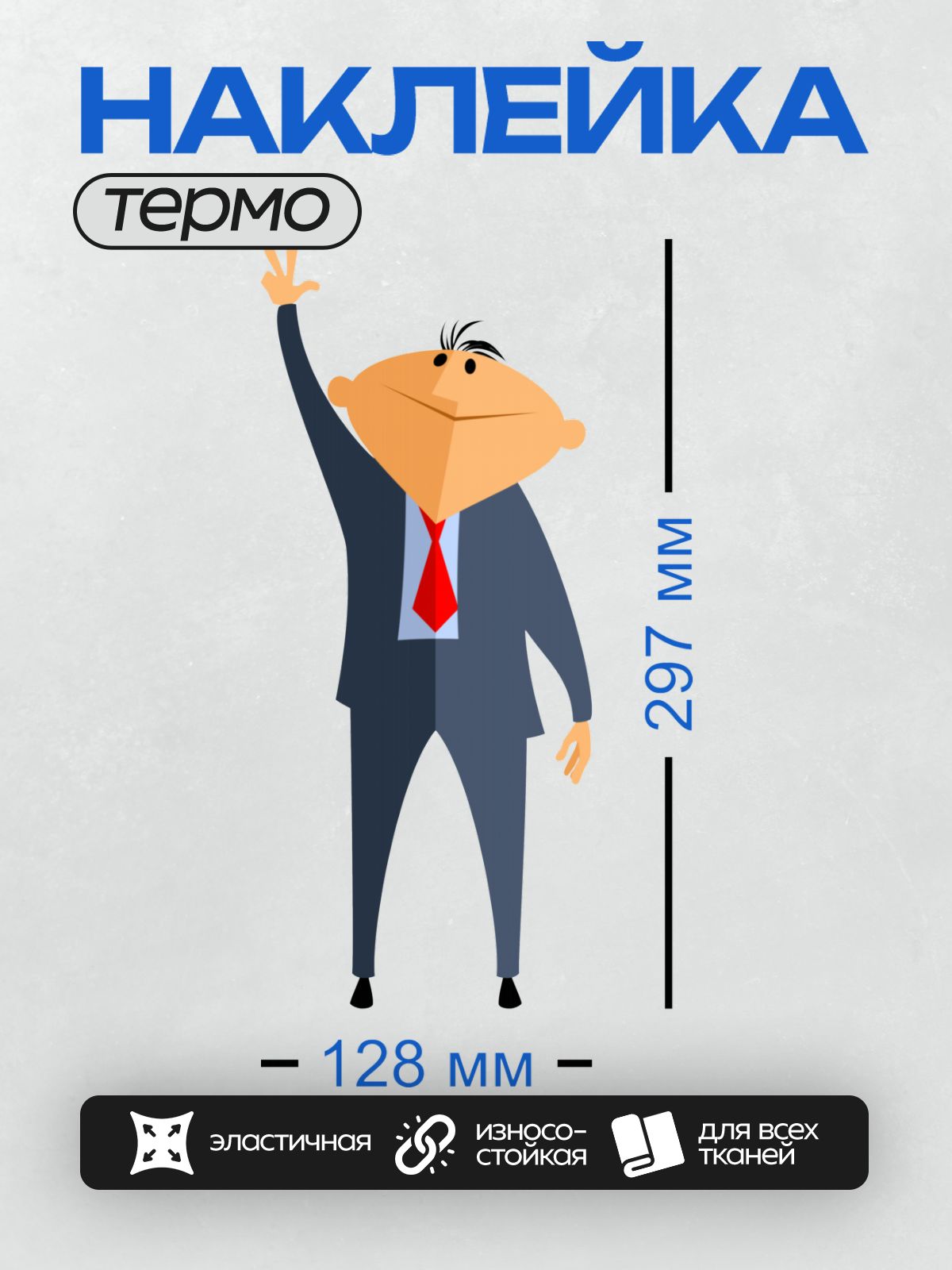 Дизайн: Мультяшный бизнесмен в костюме с поднятой рукой. — идеально подходит для декора и восстановления одежды.