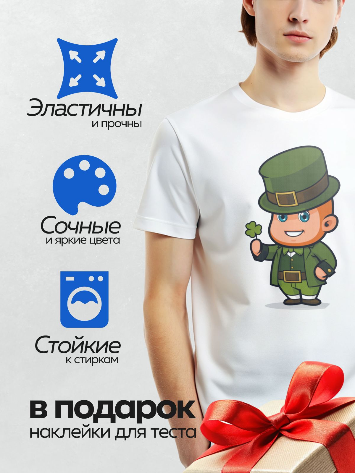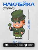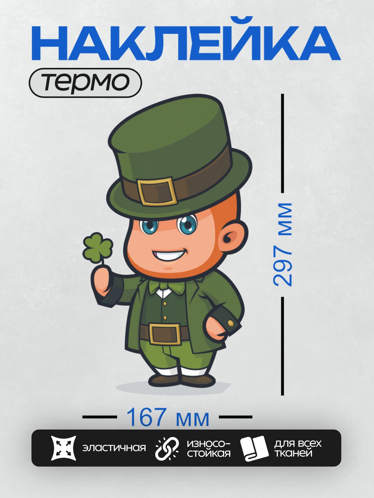 Дизайн: Мультяшный лепрекон в зелёной шляпе с клевером. — идеально подходит для декора и восстановления одежды.