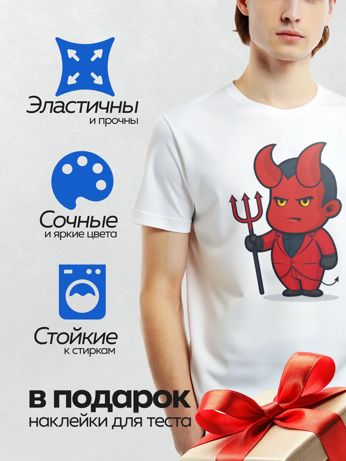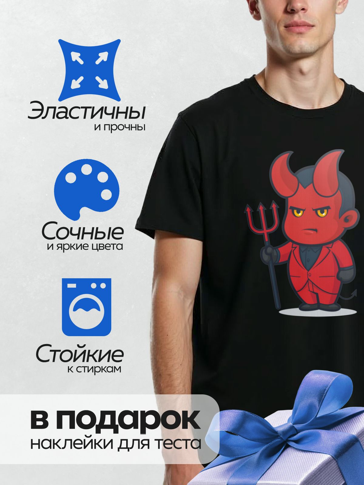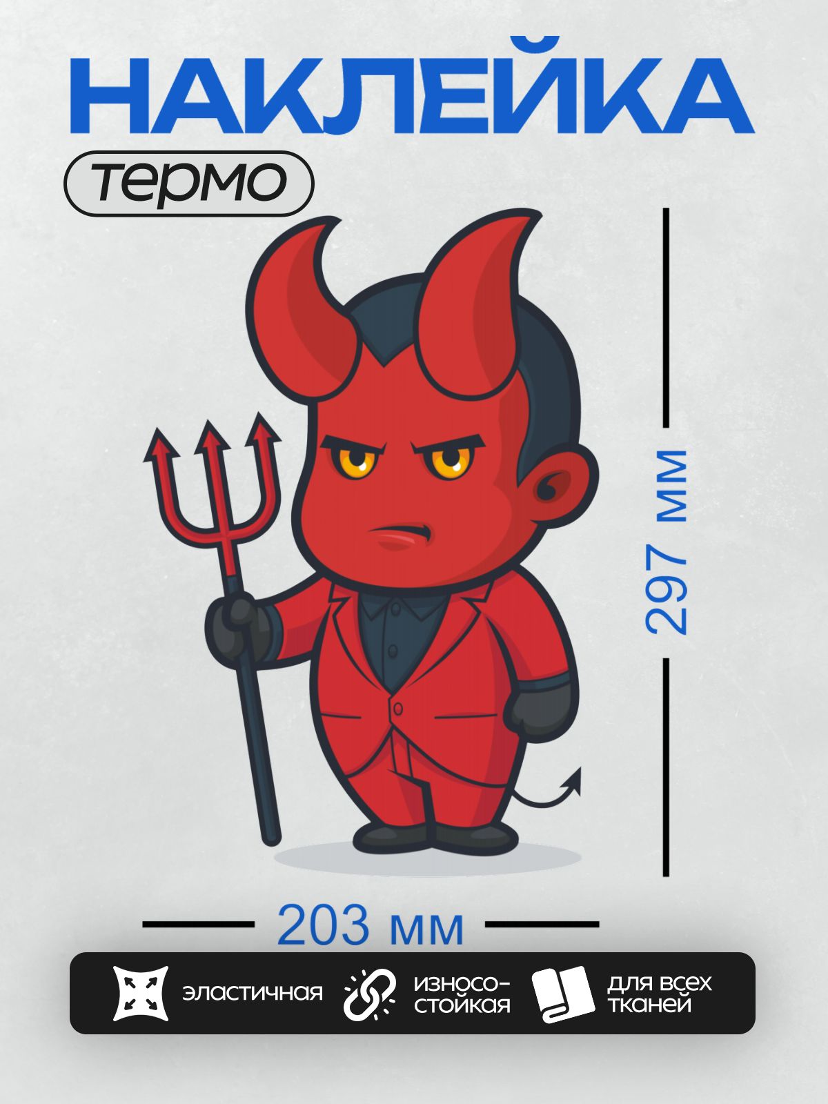 Дизайн: Мультяшный демон в красном костюме с трезубцем. — идеально подходит для декора и восстановления одежды.