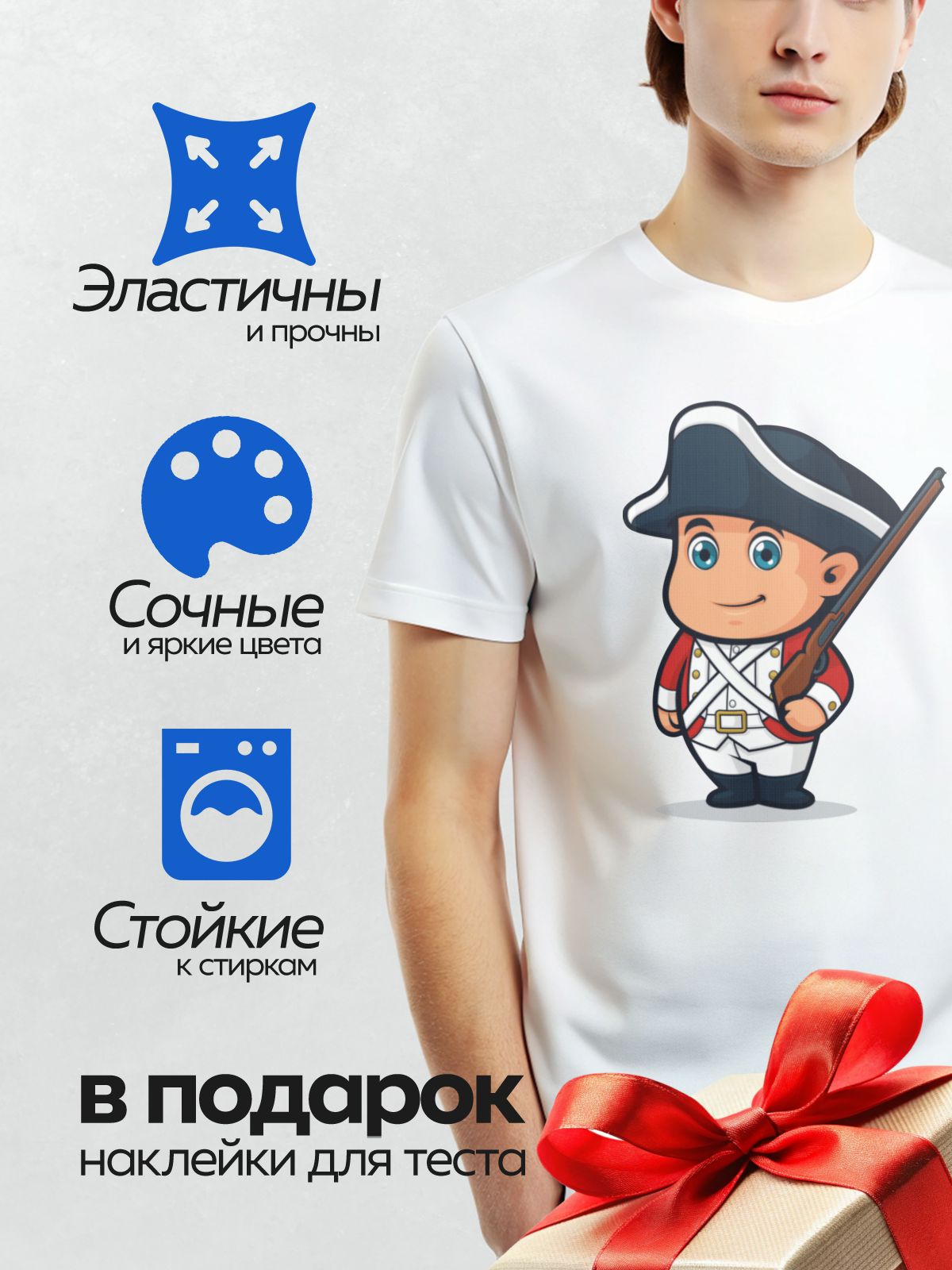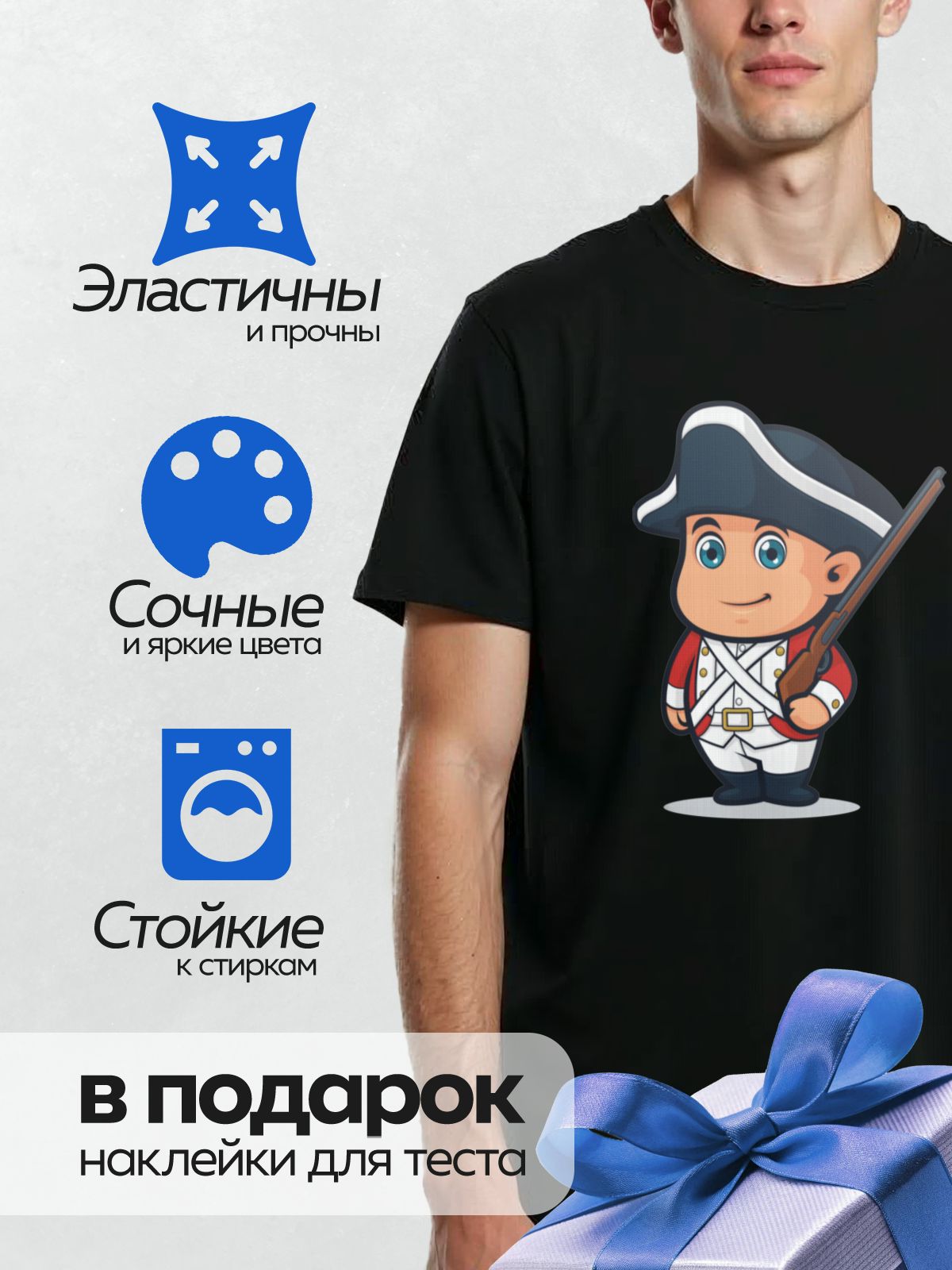 Дизайн: Мультяшный британский солдат в треуголке с ружьем. — идеально подходит для декора и восстановления одежды.