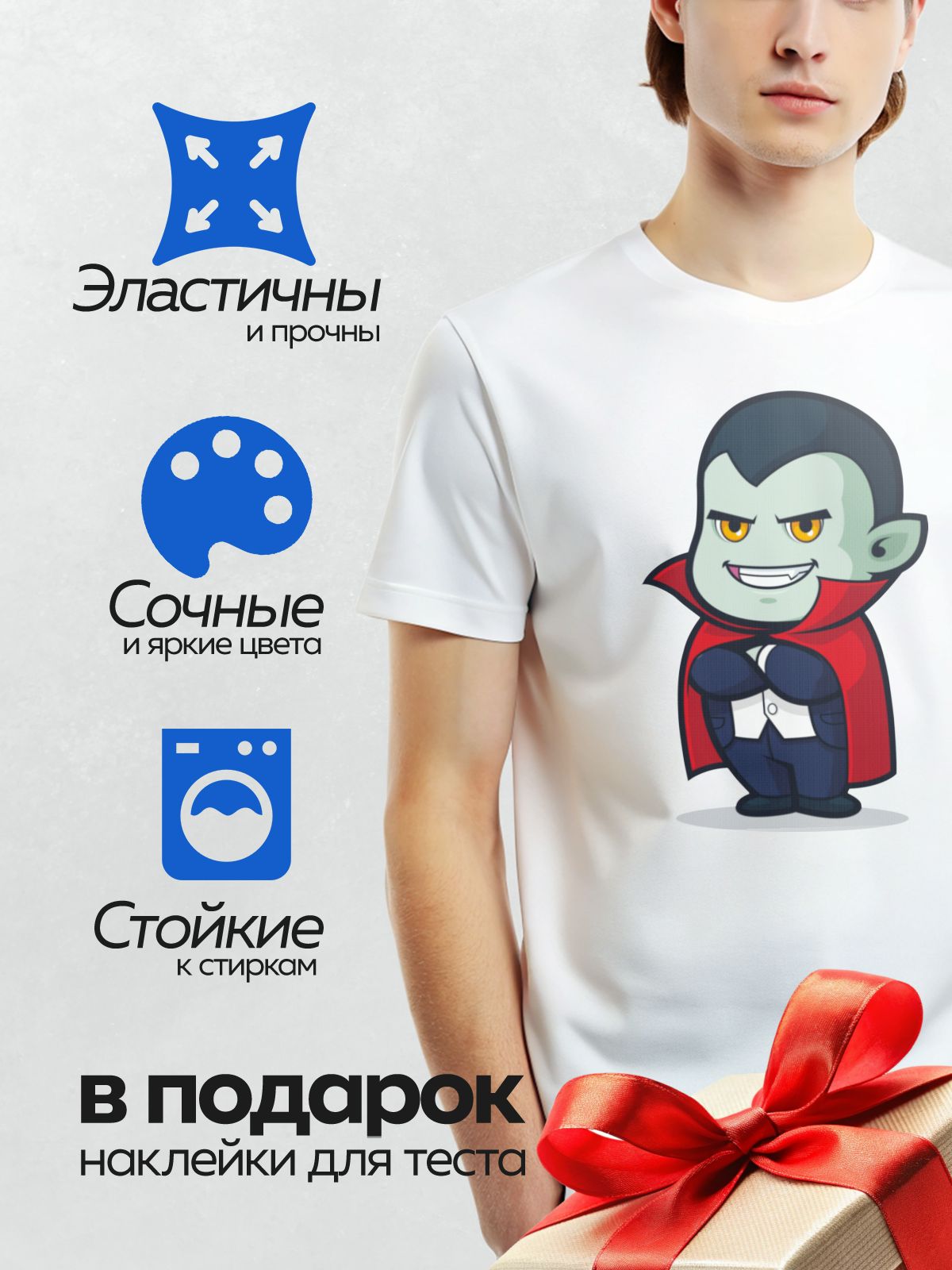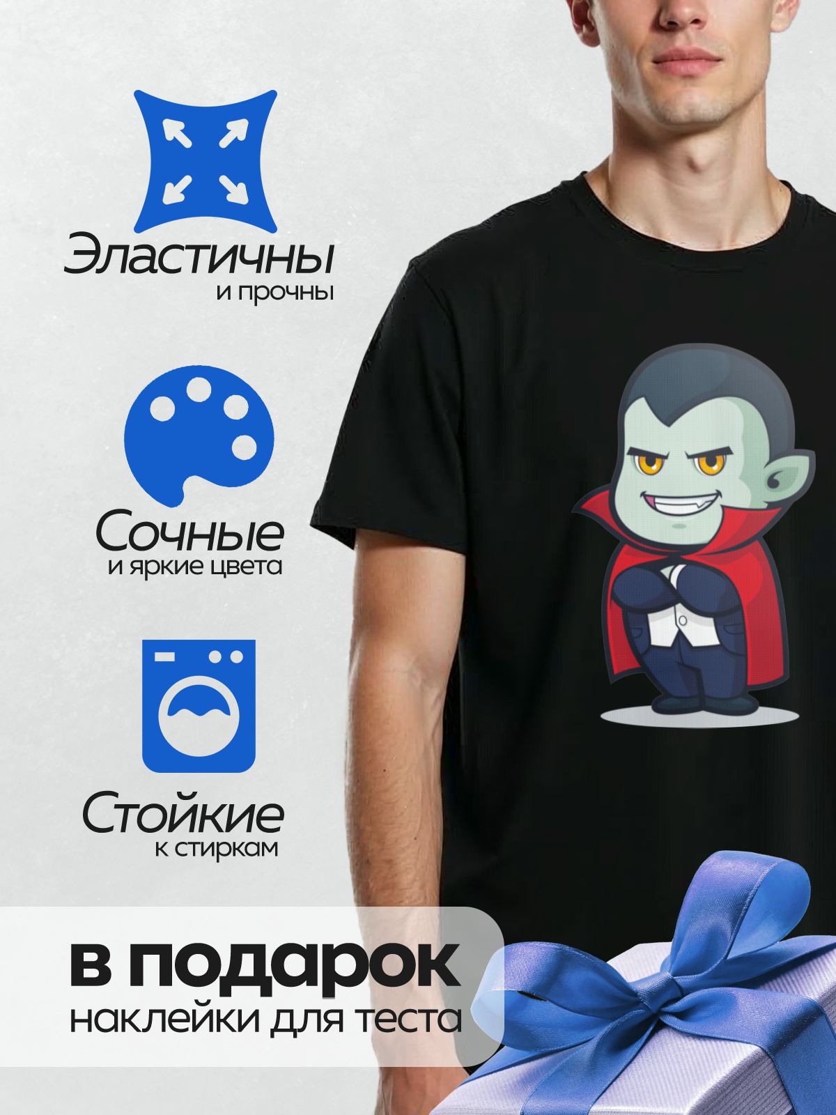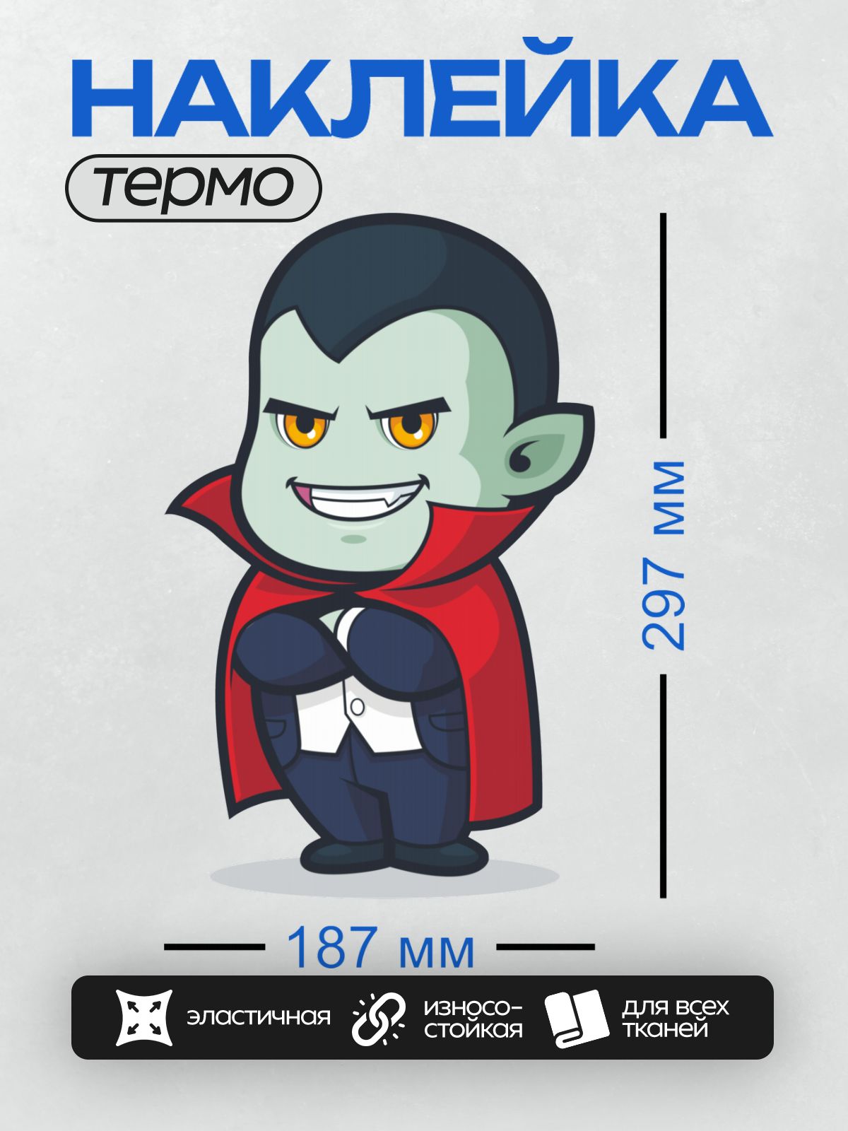 Дизайн: Мультяшный вампир с красным плащом и клыками. — идеально подходит для декора и восстановления одежды.