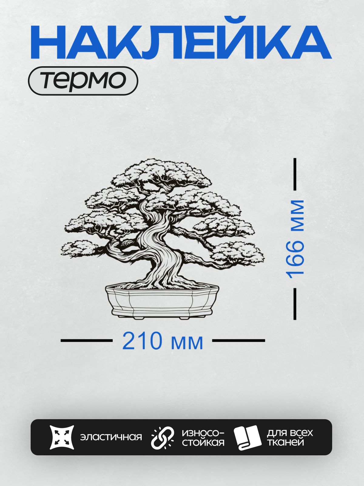 Термонаклейка на одежду DTF / На изображении представлено дерево бонсай в стилизованной черно-белой графике. Оно находится в горшке, имеет изогнутый ствол и густую крону.