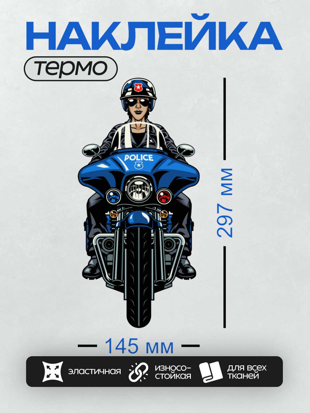 Дизайн: Полицейский на синем мотоцикле с надписью “POLICE”. — идеально подходит для декора и восстановления одежды.
