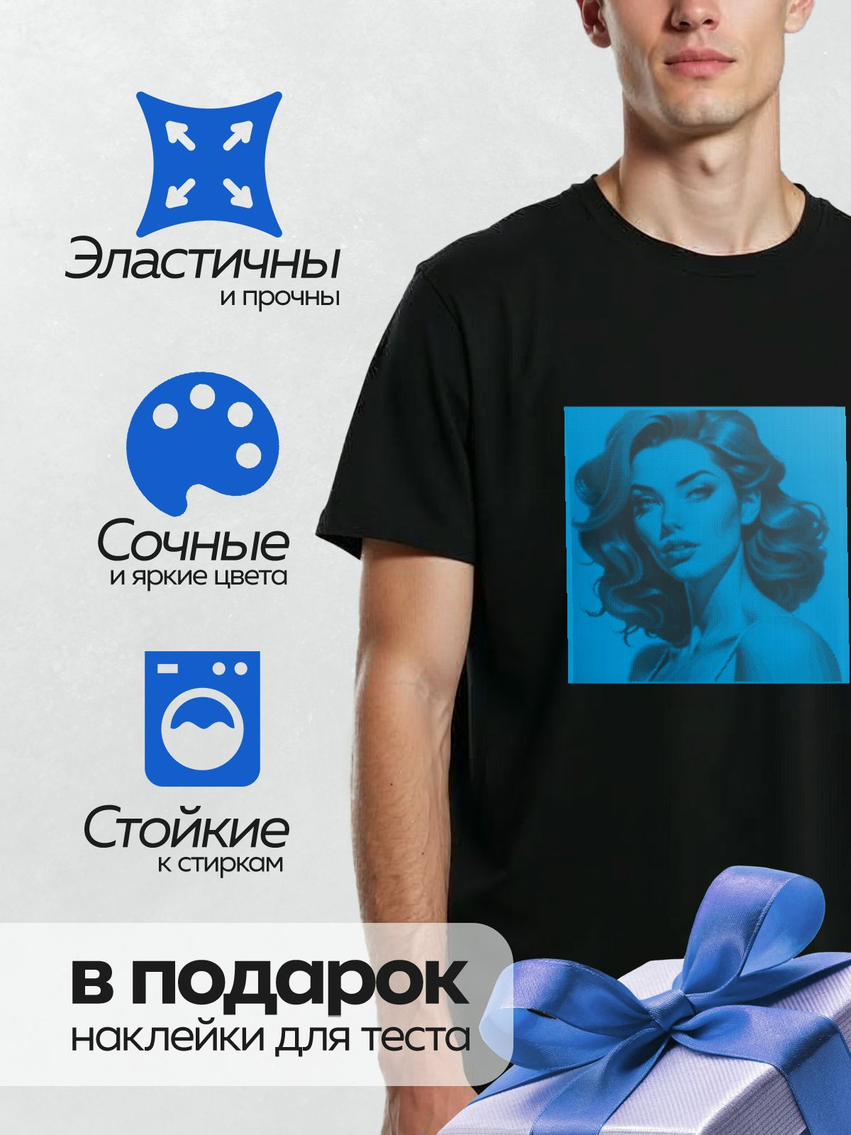 Термонаклейка на одежду DTF / Ретро-девушка в стиле поп-арт с волнистыми волосами на синем фоне.