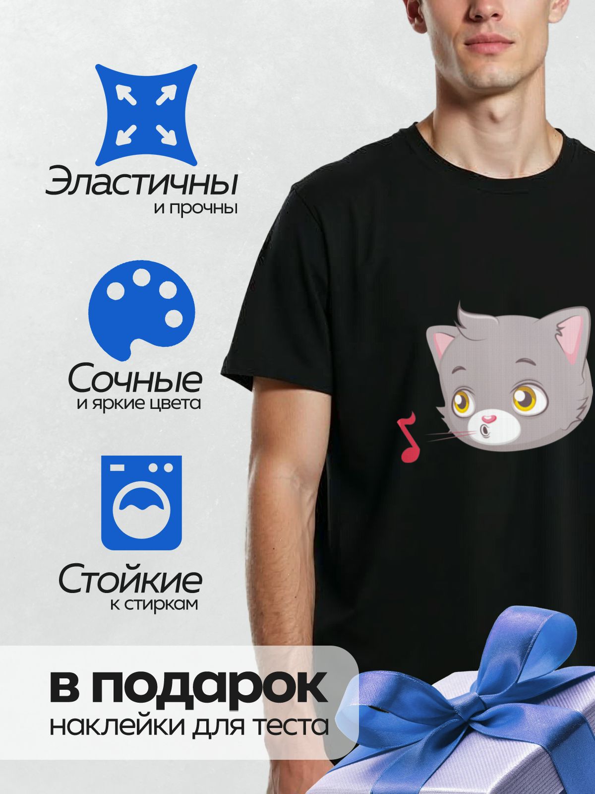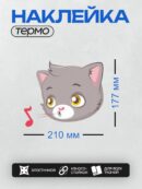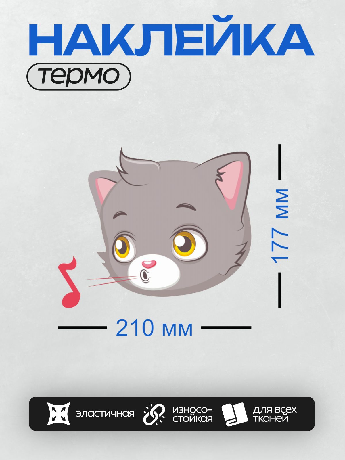 Дизайн: Серый мультяшный кот с желтыми глазами и музыкальной нотой. — идеально подходит для декора и восстановления одежды.