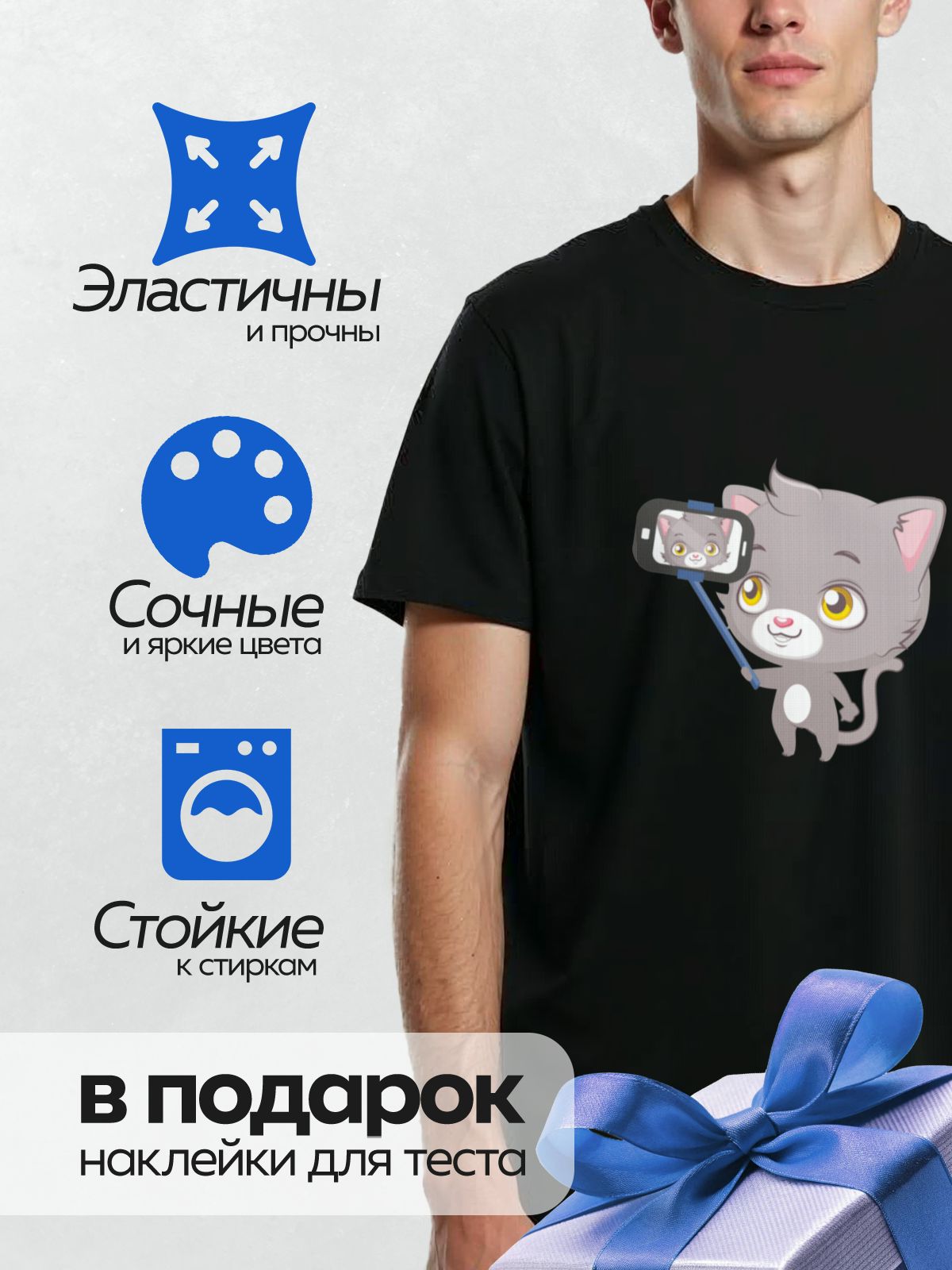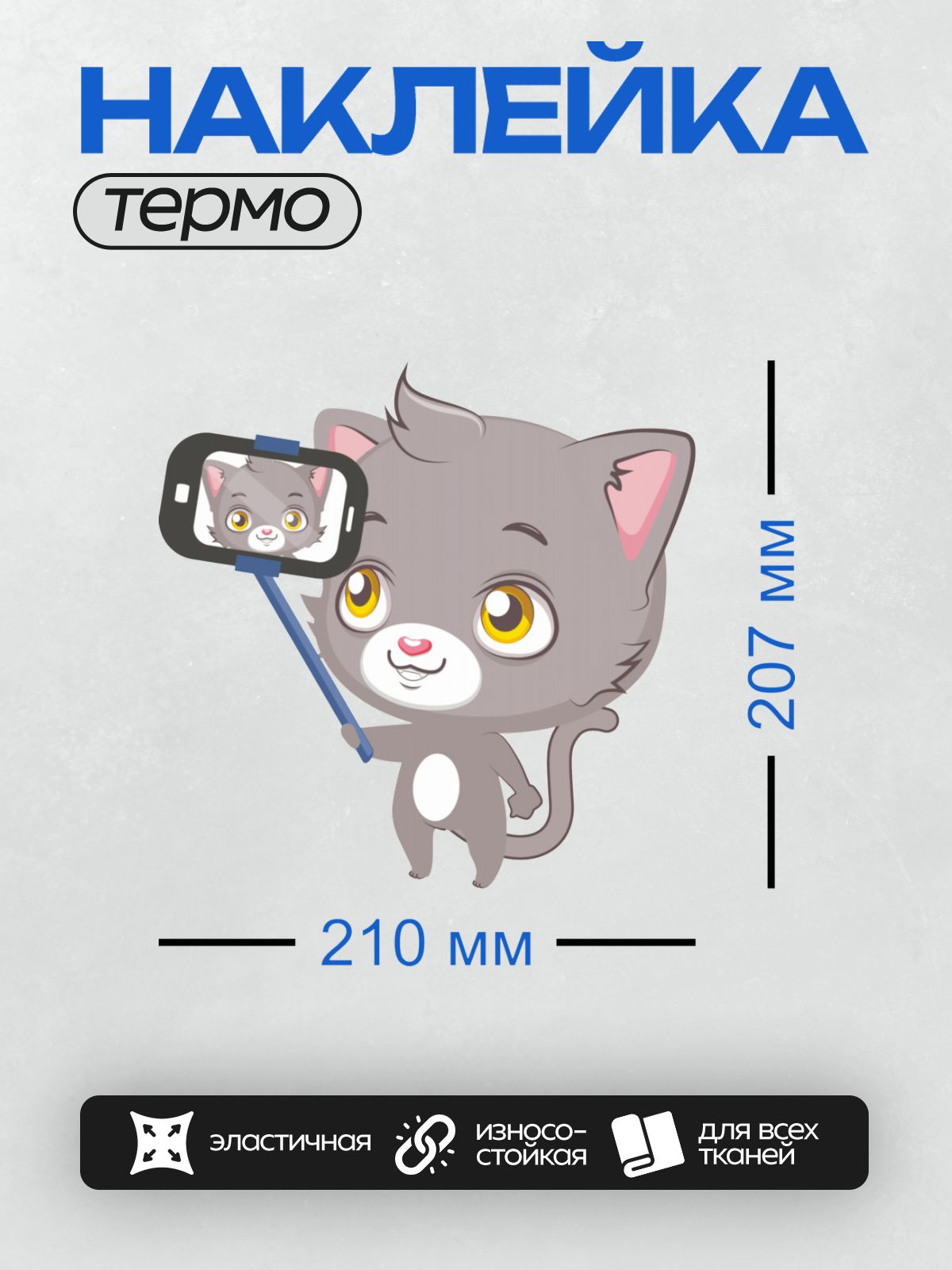 Дизайн: Серый мультяшный котёнок делает селфи с улыбкой. — идеально подходит для декора и восстановления одежды.