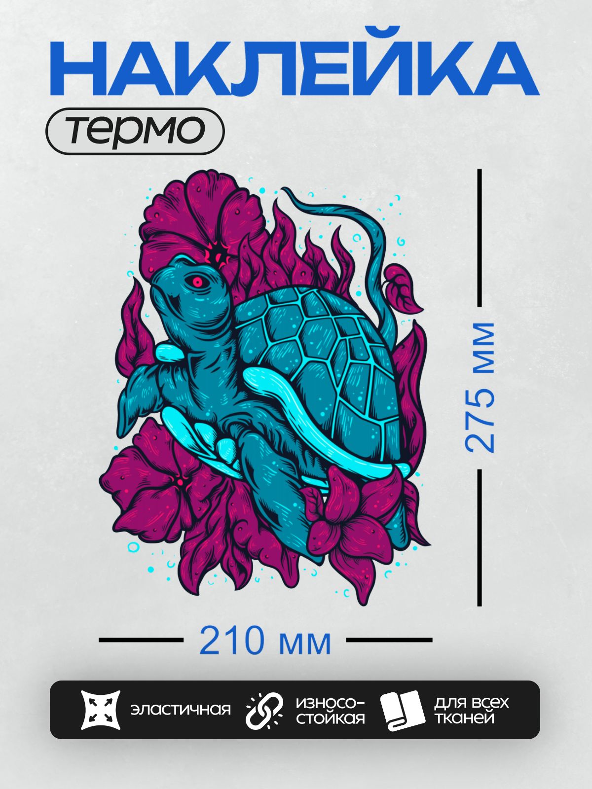 Дизайн: Синяя черепаха с красным глазом среди фиолетовых цветов. — идеально подходит для декора и восстановления одежды.