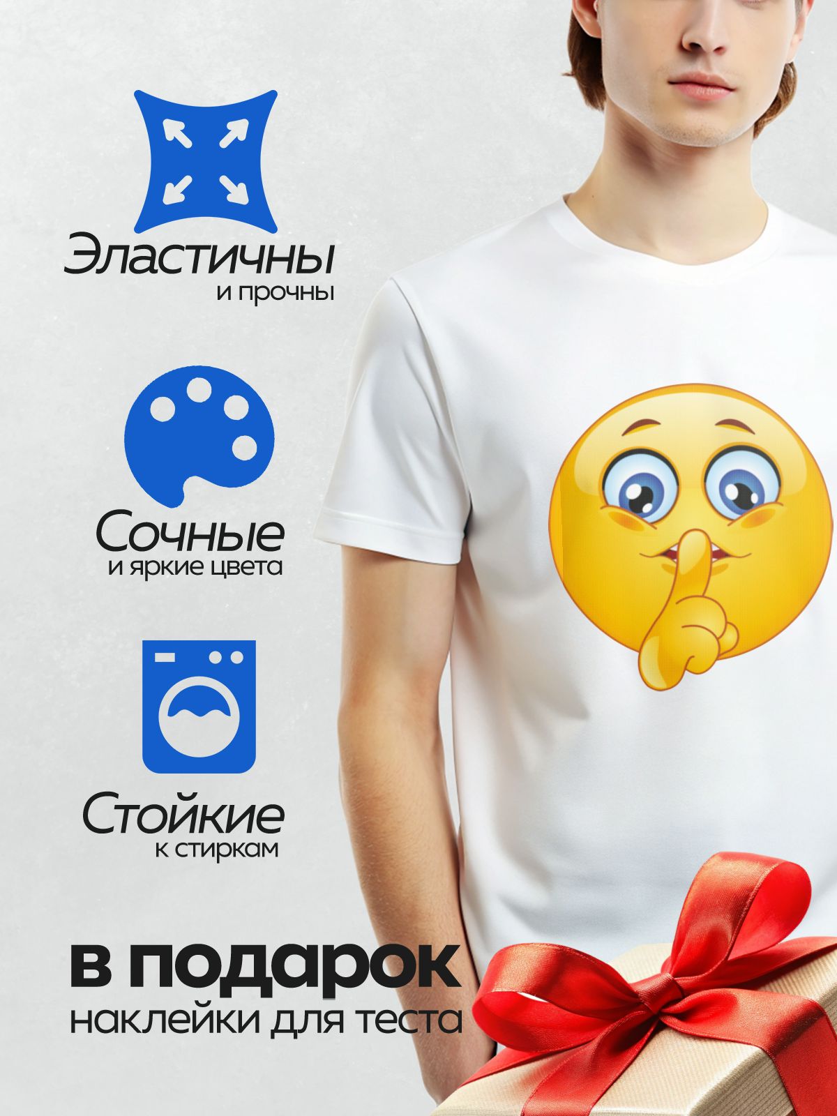 Термонаклейка на одежду DTF / Смайлик с пальцем у губ, призывающий к тишине.