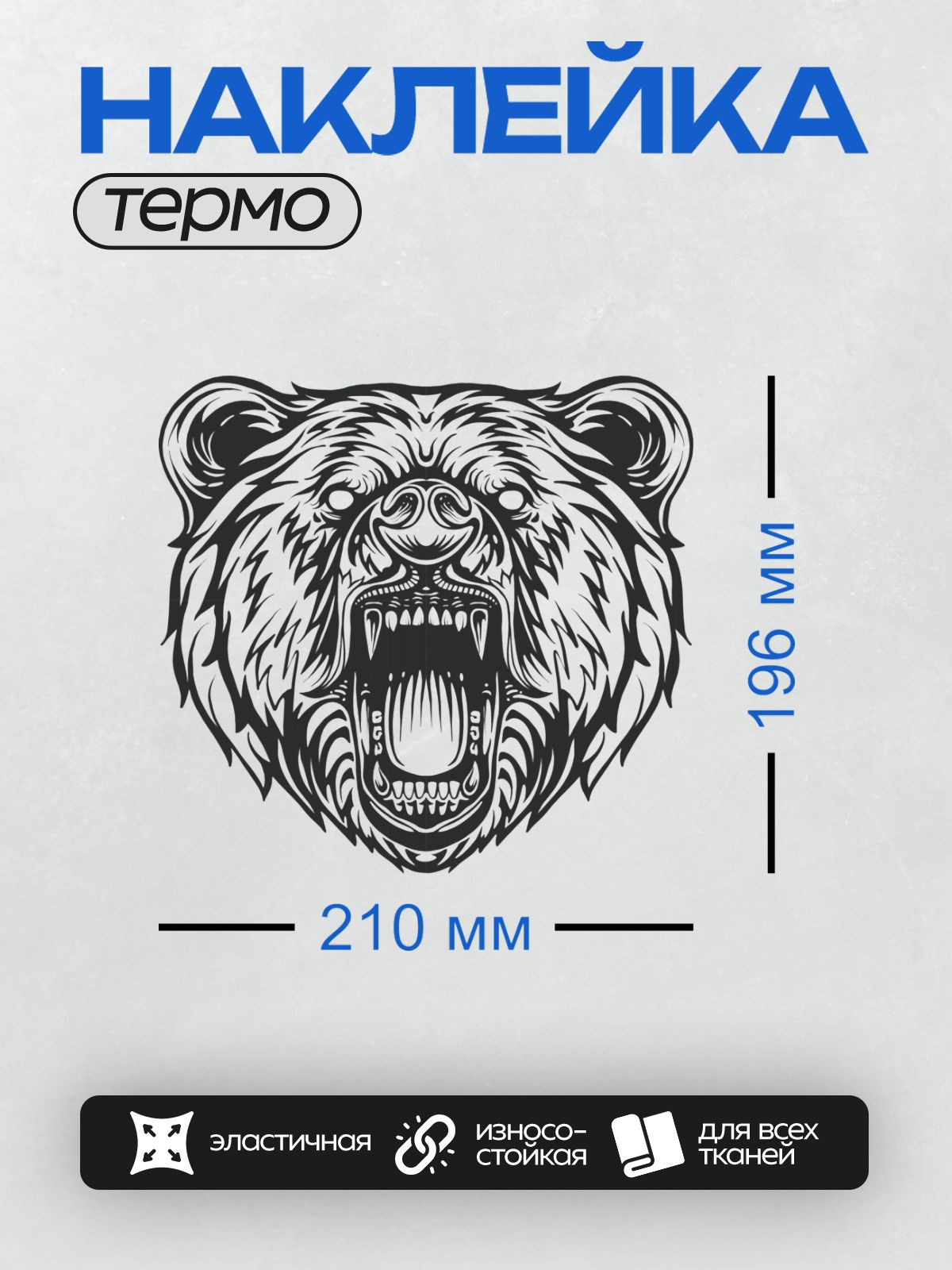 Дизайн: Стилизованный оскал медведя, черно-белый рисунок. — идеально подходит для декора и восстановления одежды.