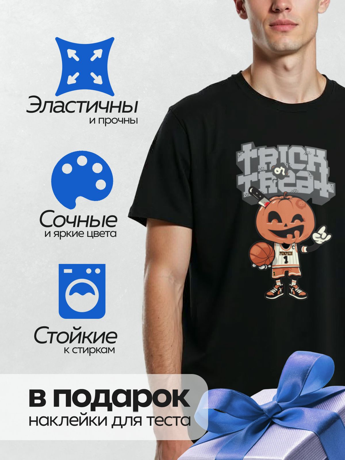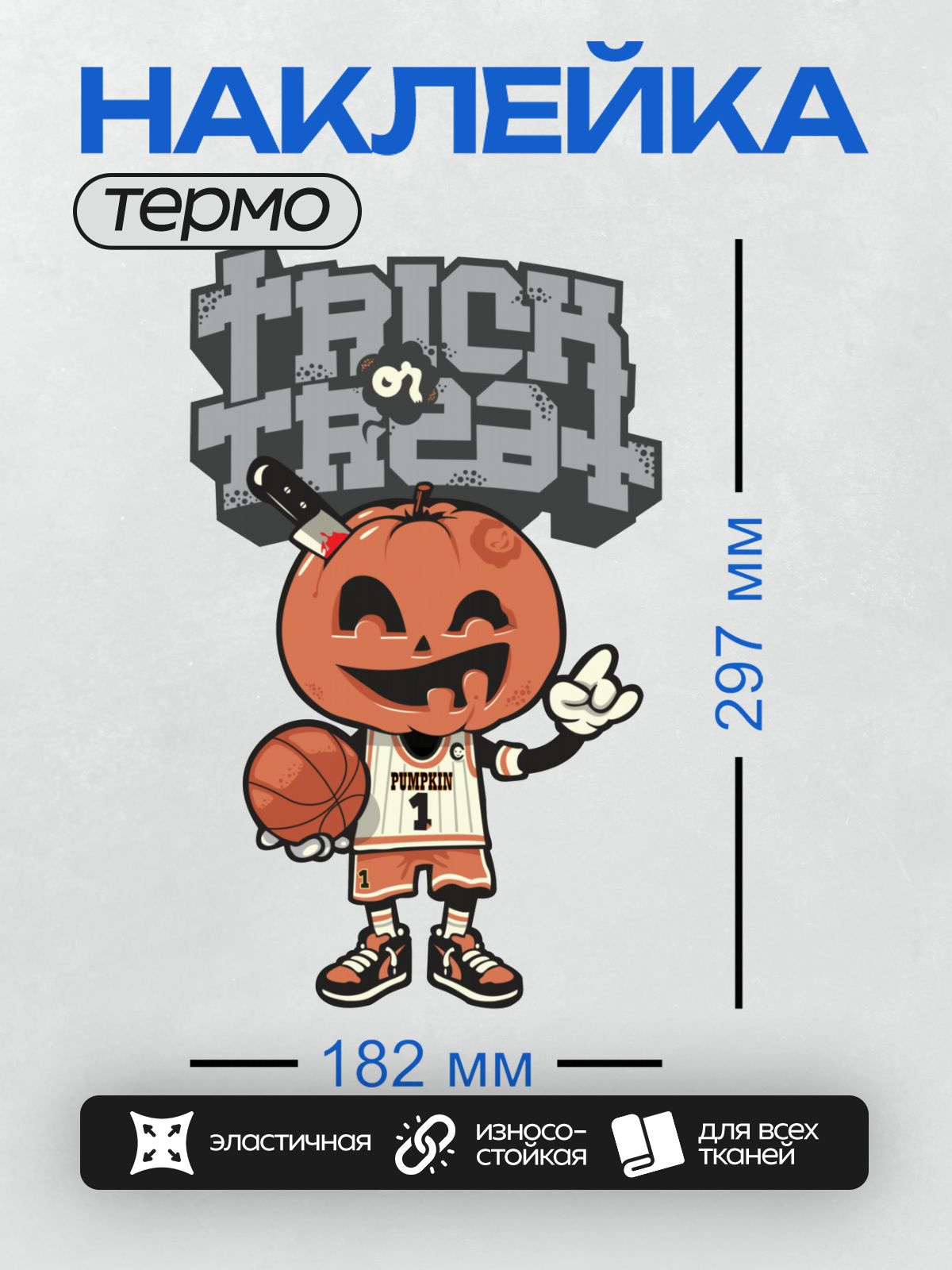 Дизайн: Тыква в баскетбольной форме с мячом, надпись “Trick or Treat”. — идеально подходит для декора и восстановления одежды.