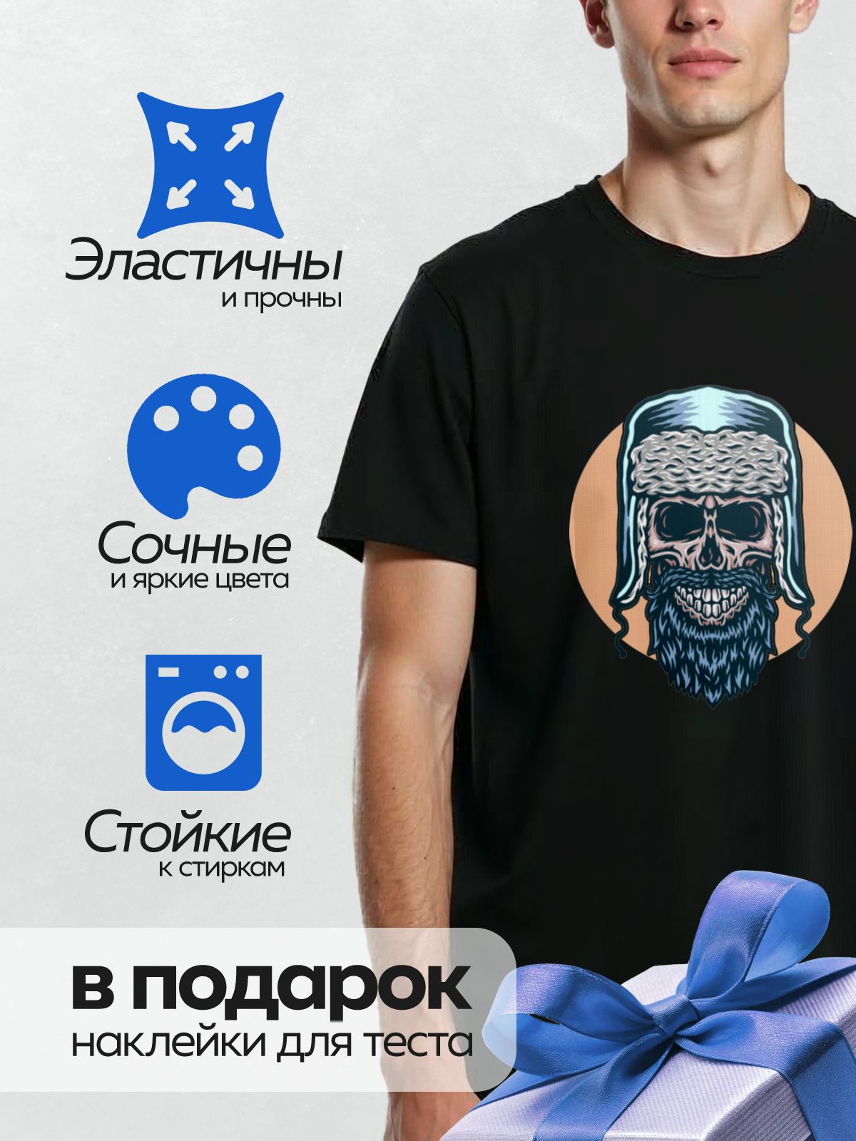 Дизайн: Череп в шапке-ушанке с густой бородой. — идеально подходит для декора и восстановления одежды.