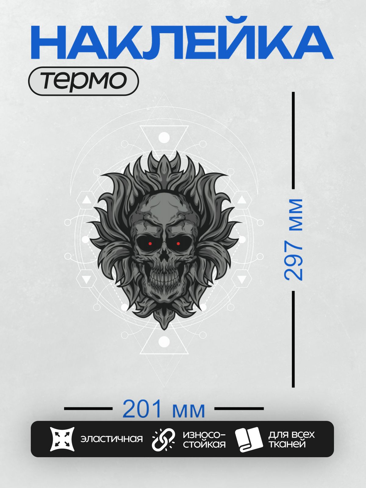 Дизайн: Череп с красными глазами и пламенем вокруг. — идеально подходит для декора и восстановления одежды.