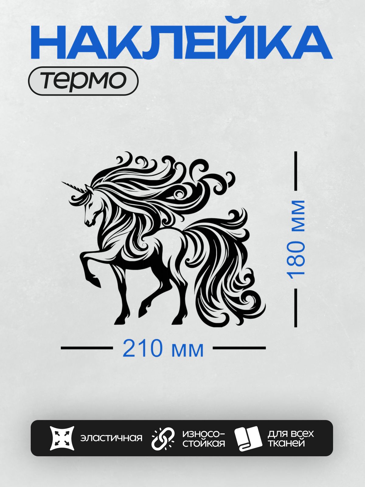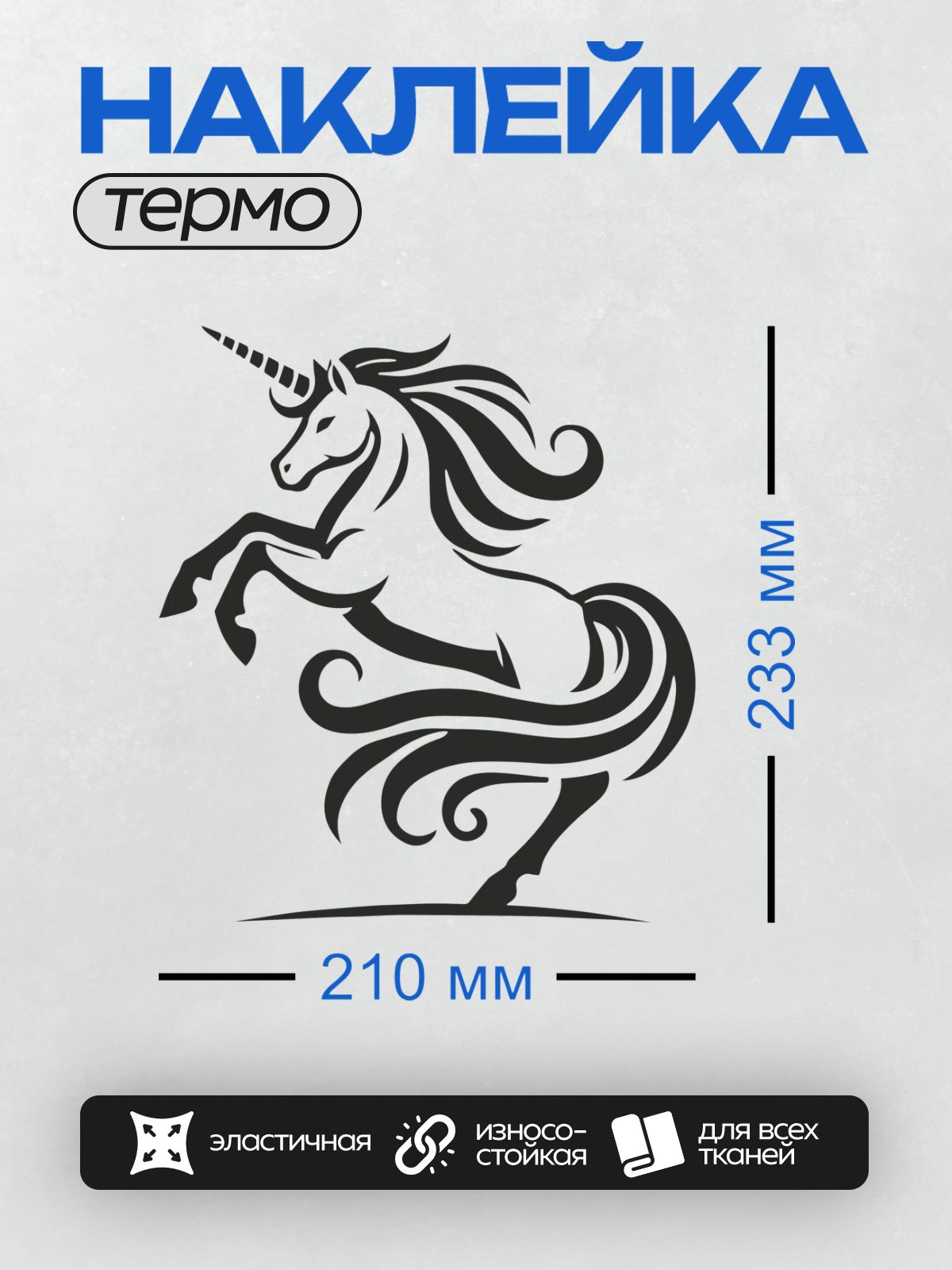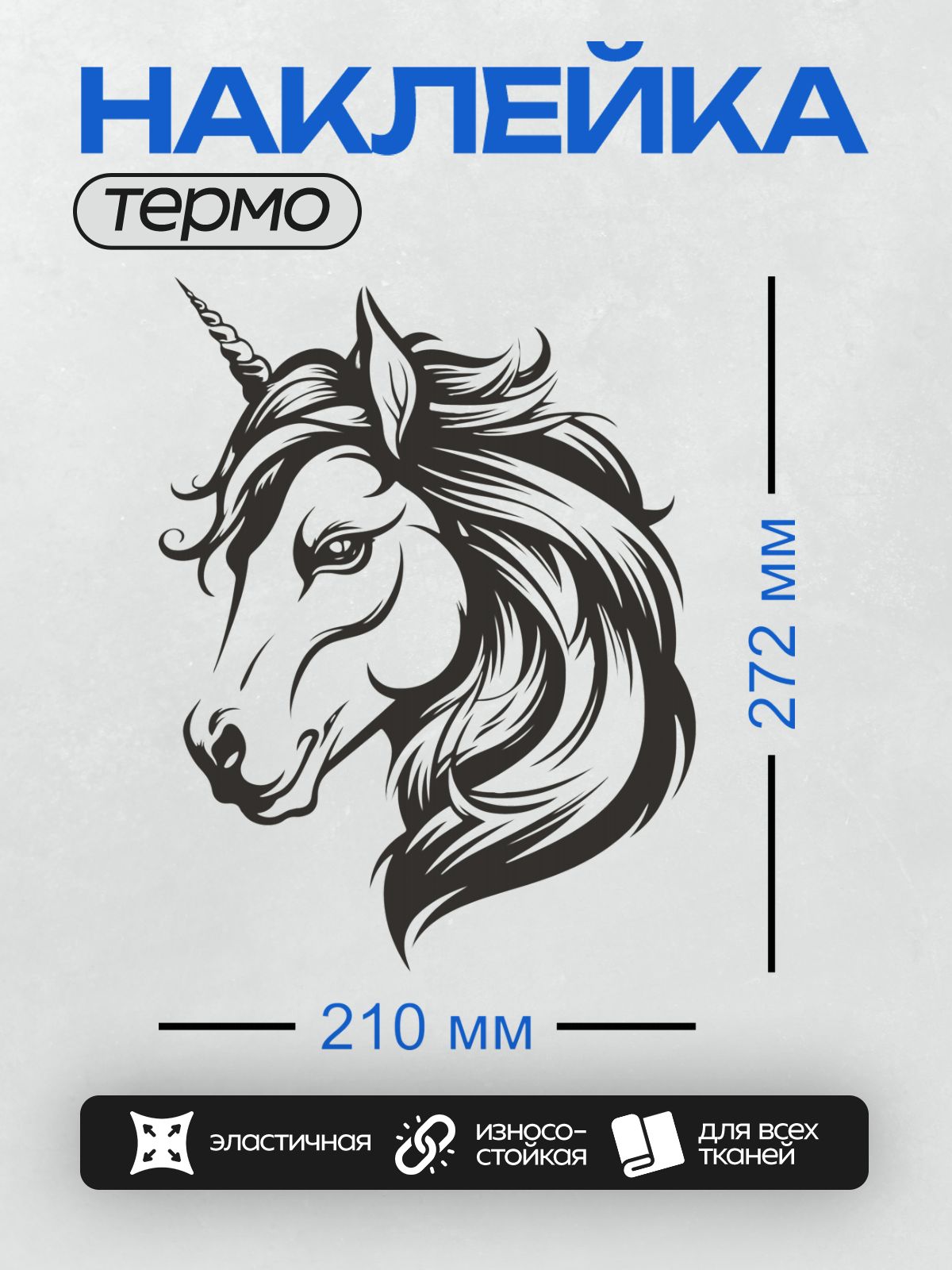 Дизайн: Черно-белый единорог с изящным узором и рогом. — идеально подходит для декора и восстановления одежды.