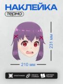 Дизайн: Аниме-девочка с фиолетовыми волосами, большими красными глазами и красными крестиками на голове. — идеально подходит для декора и восстановления одежды.
