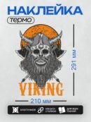 Термонаклейка на одежду DTF / Викинг с черепом, рогами и оружием на фоне оранжевого круга.