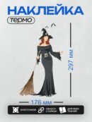 Термонаклейка на одежду DTF / Женщина в черном платье, с метлой и шляпой ведьмы.