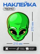 Дизайн: Зеленая голова пришельца с большими черными глазами. — идеально подходит для декора и восстановления одежды.