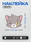 Дизайн: Милая мультяшная мордочка серого котёнка. — идеально подходит для декора и восстановления одежды.