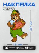 Дизайн: Мультяшный медведь с гармошкой в зелёных штанах. — идеально подходит для декора и восстановления одежды.