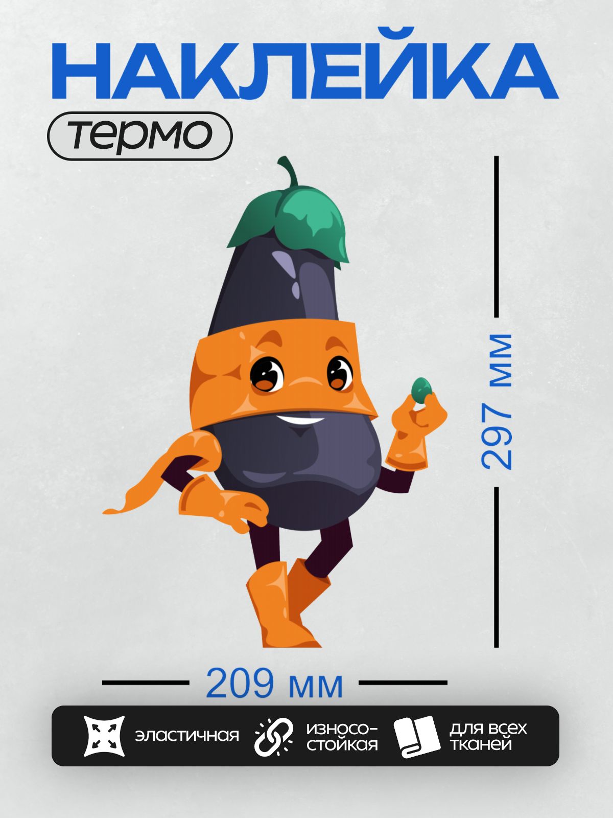 Дизайн: Мультяшный баклажан в костюме супергероя с маской. — идеально подходит для декора и восстановления одежды.