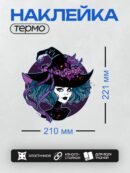 Дизайн: На изображении изображена ведьма в черной шляпе, украшенной фиолетовыми цветами и лентами. У нее голубые волосы, яркие фиолетовые глаза и выразительный макияж. Фон выполнен в темных тонах с яркими звездами, что создает магическую атмосферу. — идеально подходит для декора и восстановления одежды.