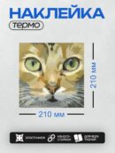Дизайн: На изображении показано лицо кошки с большими зелёными глазами, выполненное в стиле геометрической абстракции. — идеально подходит для декора и восстановления одежды.