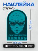 Термонаклейка на одежду DTF / Синий инопланетянин с надписью “I don’t believe in humans”.