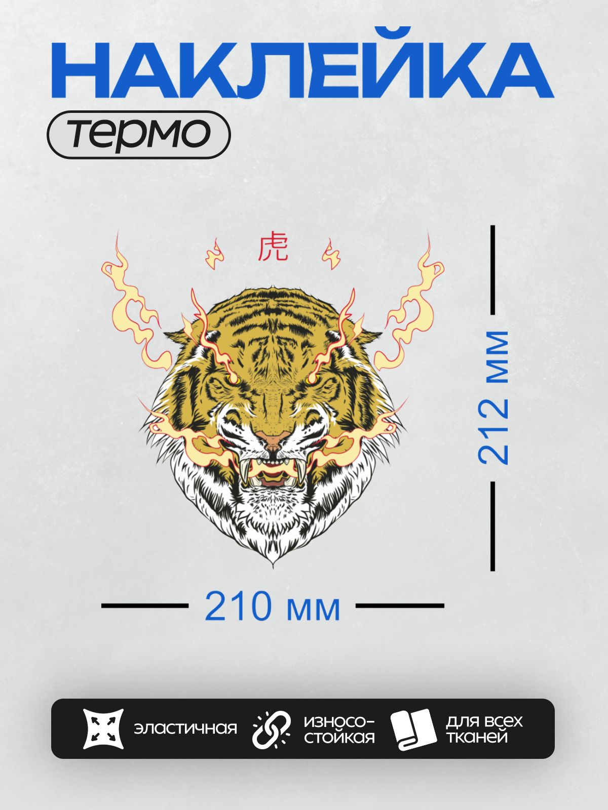 Дизайн: Тигр с пламенем и китайским иероглифом “气” (энергия). — идеально подходит для декора и восстановления одежды.