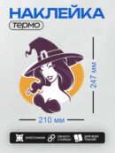 Дизайн: Улыбающаяся ведьма в фиолетовой шляпе на фоне луны. — идеально подходит для декора и восстановления одежды.