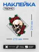 Термонаклейка на одежду DTF / Череп с яркими красными розами и зелеными листьями.