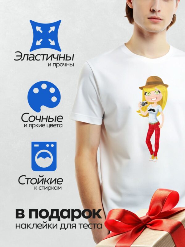 Термонаклейка на одежду DTF / Мультяшная девушка с фотоаппаратом, в шляпе и яркой одежде.