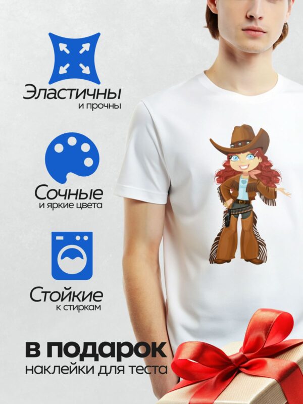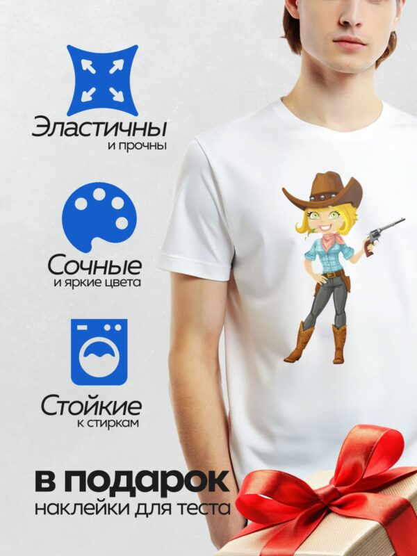 Термонаклейка на одежду DTF / Мультяшная девушка-ковбой с револьвером и шляпой.