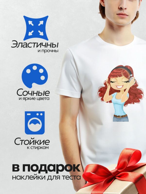 Термонаклейка на одежду DTF / Мультяшная девушка с красными волосами в наушниках, улыбается.