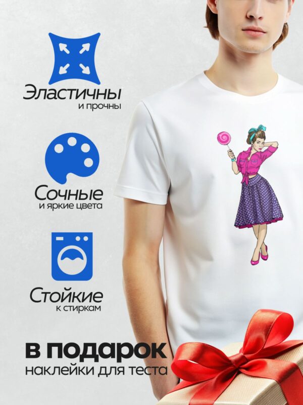Термонаклейка на одежду DTF / Женщина в стиле поп-арт с леденцом и в юбке в горошек.