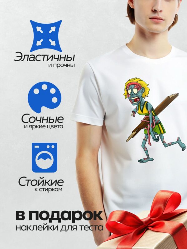 Термонаклейка на одежду DTF / Мультяшный зомби с шестом, в яркой спортивной форме.