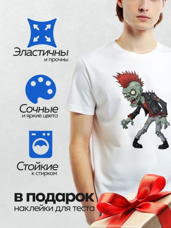 Термонаклейка на одежду DTF / Мультяшный зомби с агрессивным выражением лица и торчащими волосами.