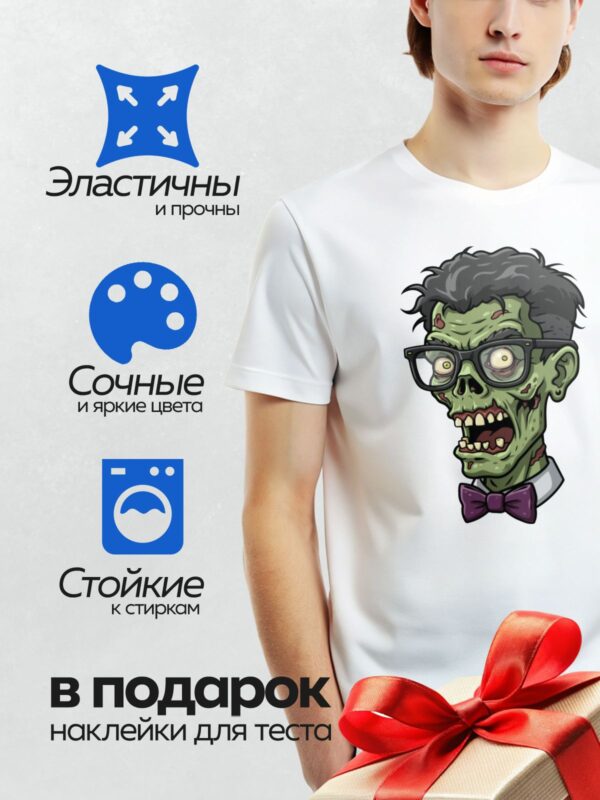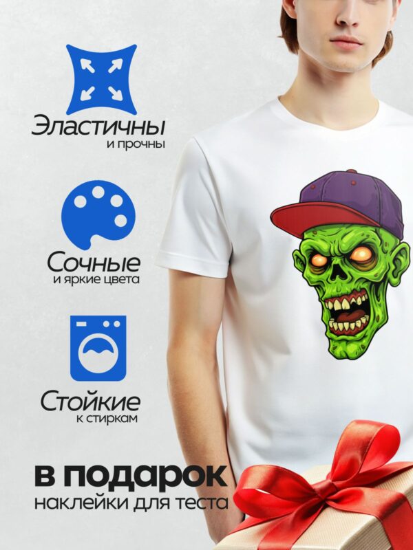 Термонаклейка на одежду DTF / Мультяшный зомби с ранами, шрамами и зловещим взглядом.