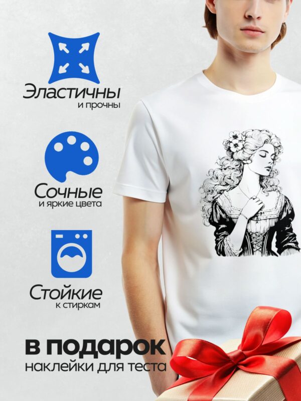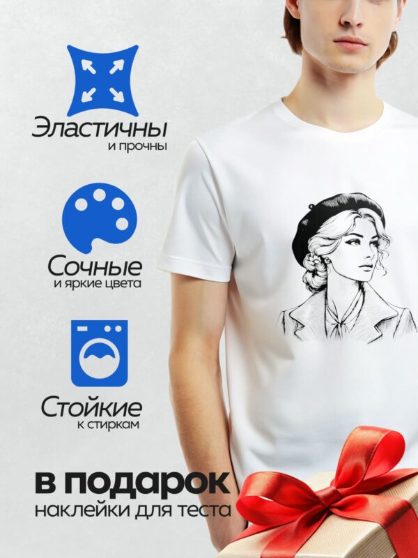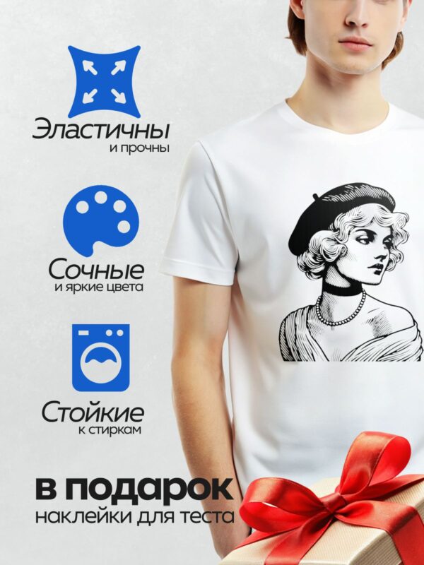 Термонаклейка на одежду DTF / Женский портрет в стиле гравюры: берет, цветок в волосах.