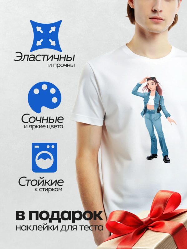 Термонаклейка на одежду DTF / Девушка в джинсовом костюме, с очками на голове.