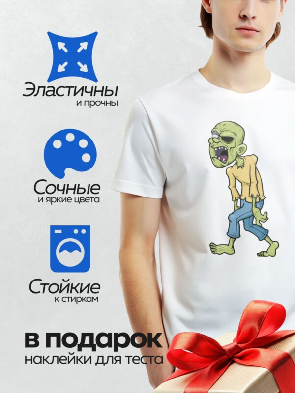 Термонаклейка на одежду DTF / Мультяшный зомби с рваной одеждой и зелёной кожей.