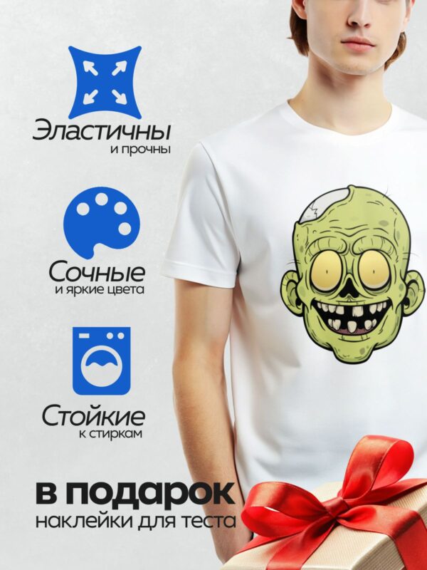 Термонаклейка на одежду DTF / Мультяшный зомби с зелёной кожей и устрашающим взглядом.