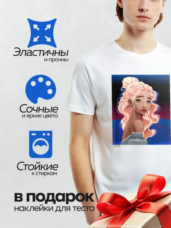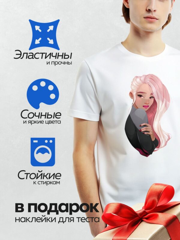 Термонаклейка на одежду DTF / Девушка с длинными светлыми волосами с розовым оттенком, выразительными глазами и губами, в черной одежде, с длинными ногтями.