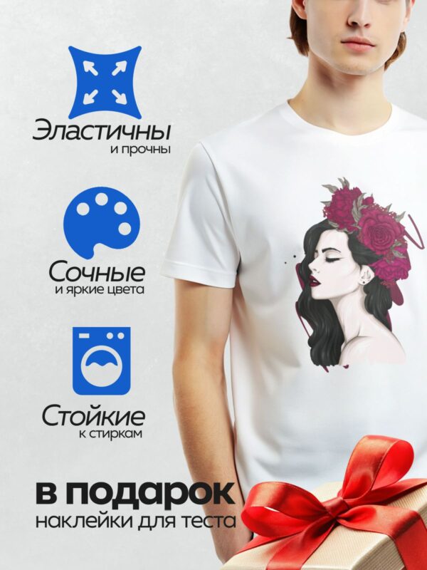 Термонаклейка на одежду DTF / Девушка с закрытыми глазами, украшенная венком из пионов и роз.