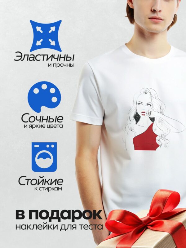 Термонаклейка на одежду DTF / Девушка в красном платье с длинными волнистыми волосами.