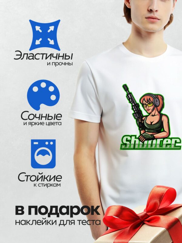Термонаклейка на одежду DTF / Мультяшная девушка с автоматом, в наушниках и очках.