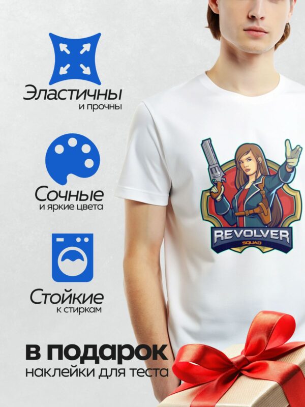 Термонаклейка на одежду DTF / Мультяшная девушка с револьвером и надписью “Revolver Squad”.