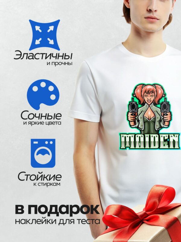 Термонаклейка на одежду DTF / Девушка с рыжими волосами, в голубой рубашке, с пистолетом.