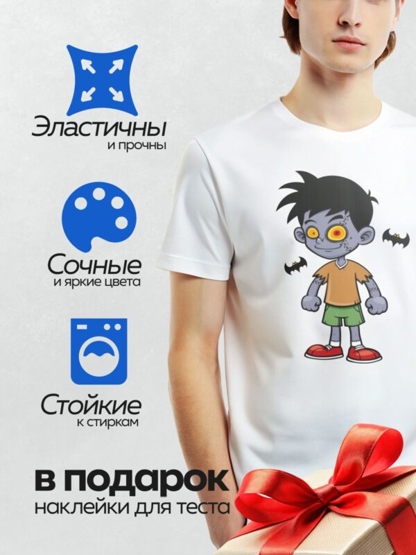 Термонаклейка на одежду DTF / Мультяшный мальчик-зомби с красными глазами и швами на лице. На нём оранжевая футболка и зелёные шорты.