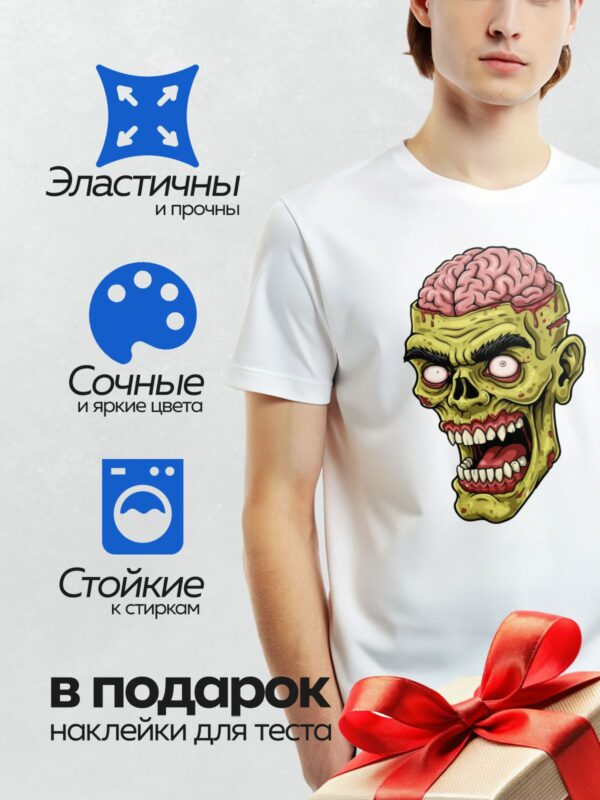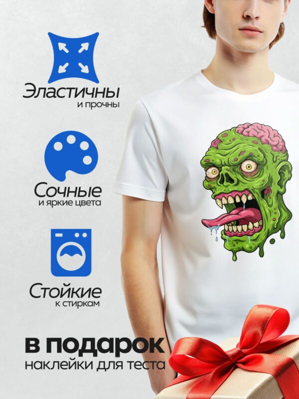 Термонаклейка на одежду DTF / Мультяшный зомби с червями на голове и в одежде.